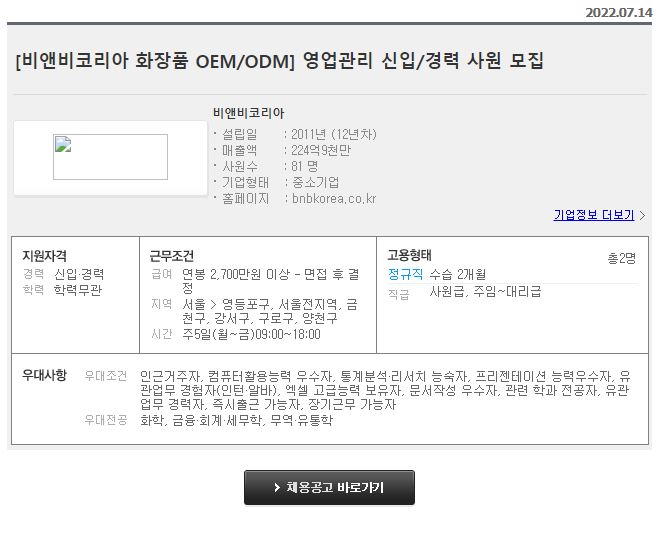 비앤비코리아 - 화장품 OEM/ODM 영업관리 신입/경력 사원 모집