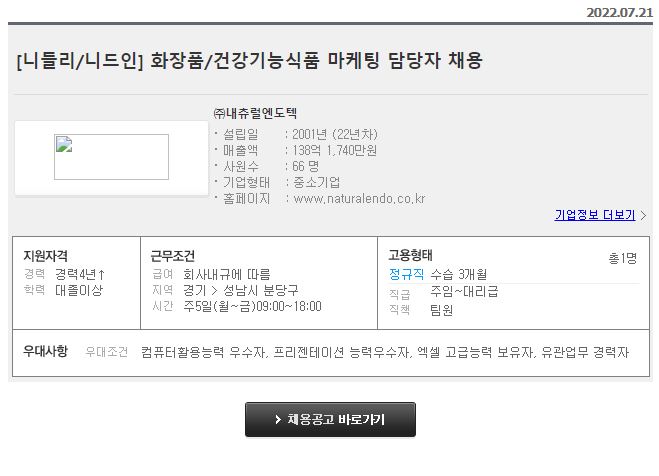 내츄럴엔도텍 - [니들리/니드인] 화장품/건강기능식품 마케팅 담당자 채용