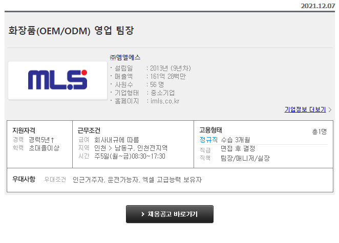 (주)엠엘에스 - 화장품(OEM/ODM) 영업 팀장
