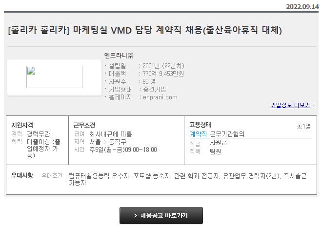 엔프라니 - [홀리카 홀리카] 마케팅실 VMD 담당 계약직 채용(출산육아휴직 대체)