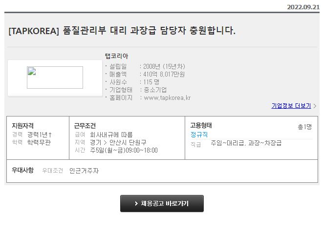 탭코리아 - [TAPKOREA] 품질관리부 대리 과장급 담당자 충원합니다.