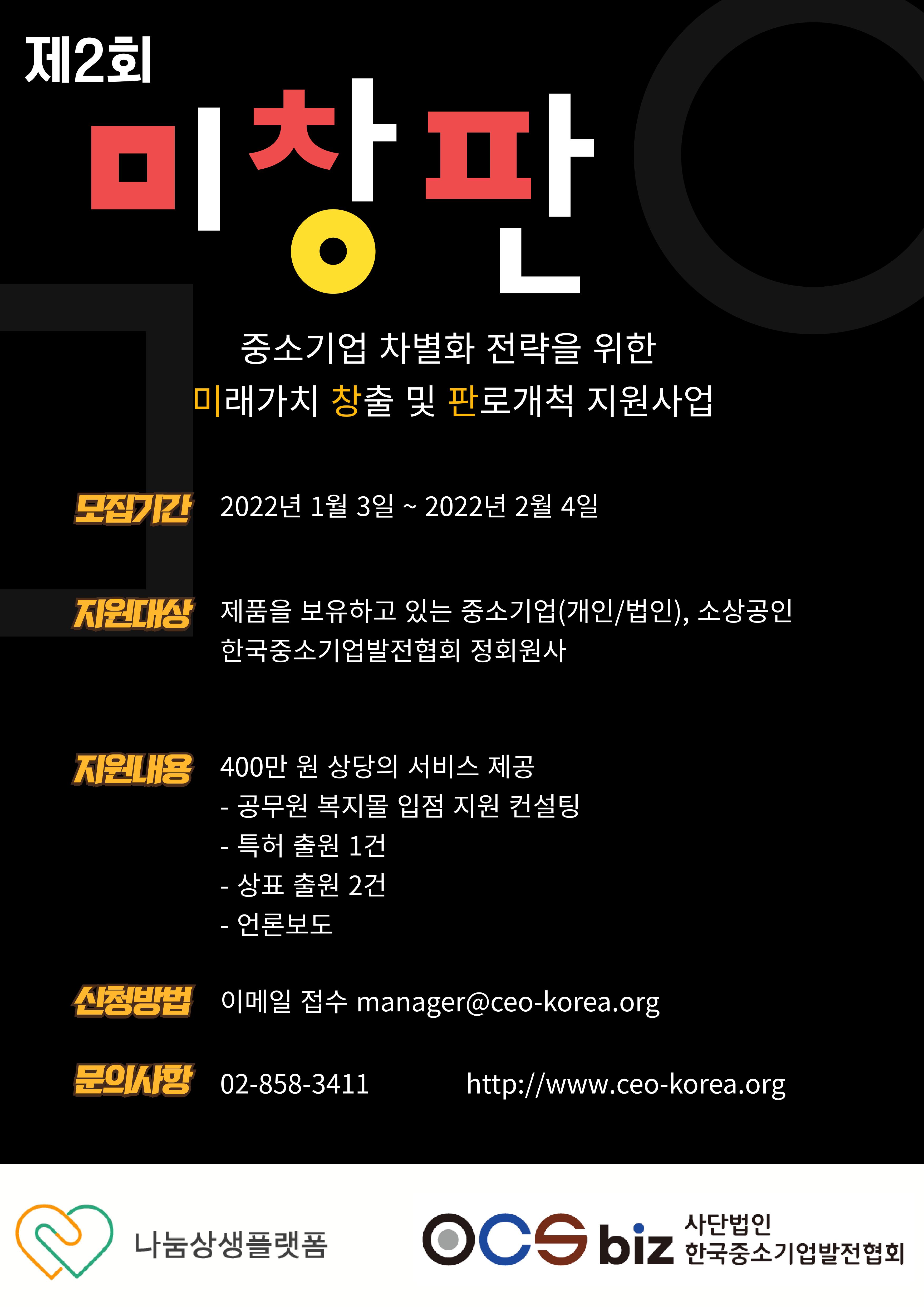 제 2회 중소기업 차별화 전략을 위한 미래가치 창출 및 판로개척 지원사업 모집 공고(~02/04 17:00) |