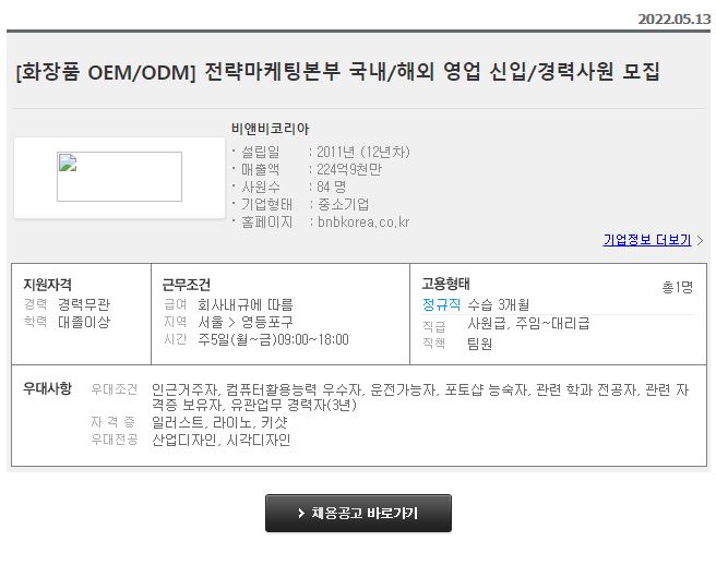 비앤비코리아 - [화장품OEM/ODM] 전략마케팅본부 국내/해외 영업 신입/경력사원 모집