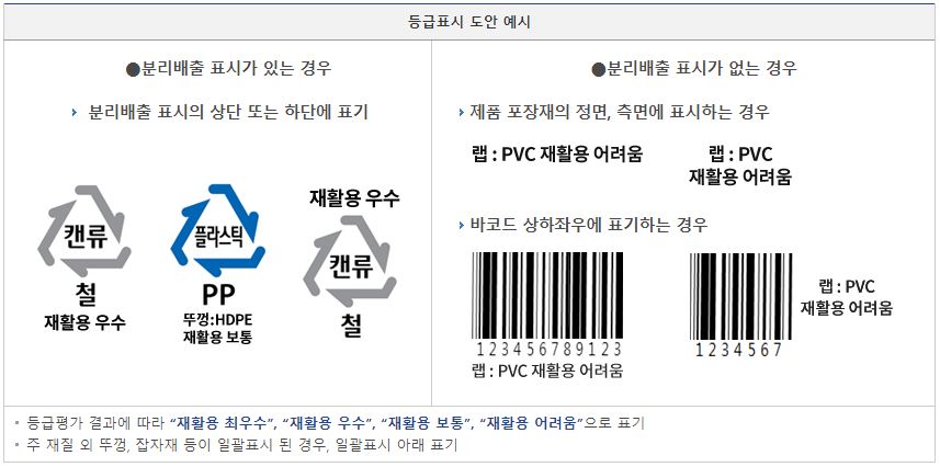 (재활용 보통 이상은 의무생산자 선택) ㆍ분리배출 표시 예외 포장재 중 PVC 및 PVDC를 사용하는 필름·시트형 포장재는 표시 대상