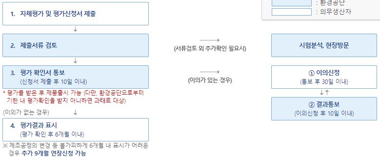 ❍ 신청시기 : 의무생산자는 자체평가 실시 후 포장재의 제조·수입 또는 이를 이용하여 제품을 판매하기 이전에 포장재 재질·구조 평가 신청서를 환경공단 이사장에게 제출