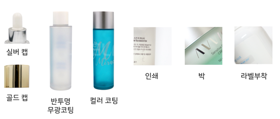 용기에 후가공은 금속, 코팅, 인쇄, 박, 라벨 부착 등 원하는대로 가능해요.