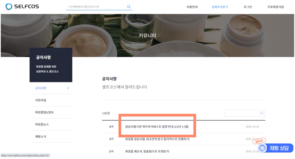 그래서 셀프코스에서는 국내 주요 화장품 임상시험기관들의 피부자극테스트 일정을 한번에 모아놓고 있습니다. 셀프코스 웹사이트에 접속하시고 좌측 하단 공지사항을 클릭하시면