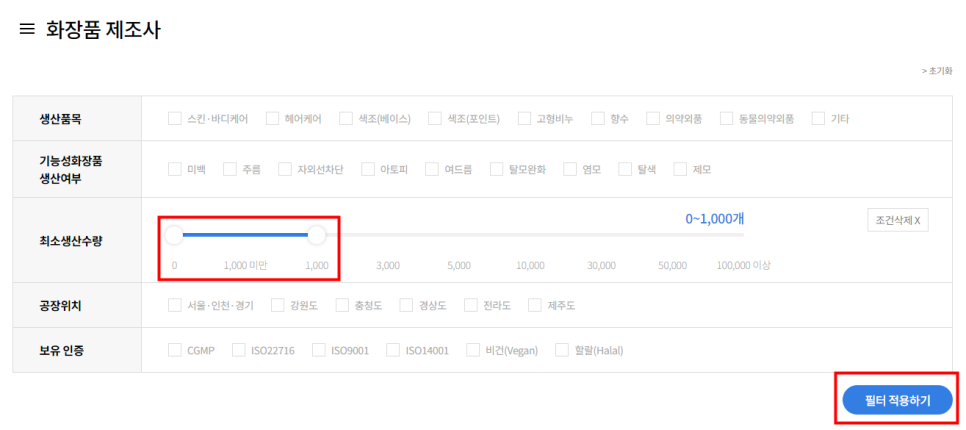 그럼 위 이미지와 같은 화면이 뜨는데요, 여기서 최소생산수량을 1,000개로 설정해 보시고 '필터 적용하기'를 눌러 주세요!