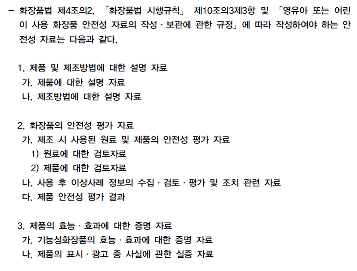 만 3세 이하 영유아에게 더 사용 못 하는 성분들이 많은 걸 확인하실 수 있어요. 그리고 영유아, 어린이용 화장품은 특별한 관리 감독이 필요해서 구비해야 할 서류도 좀 더 많습니다. <안전성 자료>라고 하는데요, 자세히는 다음과 같습니다.
