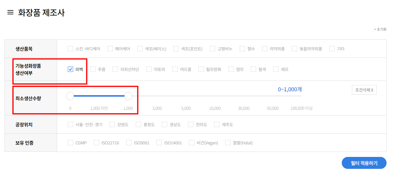 1. 먼저 셀프코스 홈페이지에 접속해 주세요. 메인 페이지에서 '화장품 제조사'를 클릭해 주세요. 2. 분류를 선택할 수 있는 필터가 나옵니다. 기능성 화장품 중 '미백', 최소 생산 수량은 1,000개로 선택해 볼게요. 3. 화면에 나온 미백 기능성 제품을 소량으로 생산하는 제조사를 확인해 주시면 됩니다.