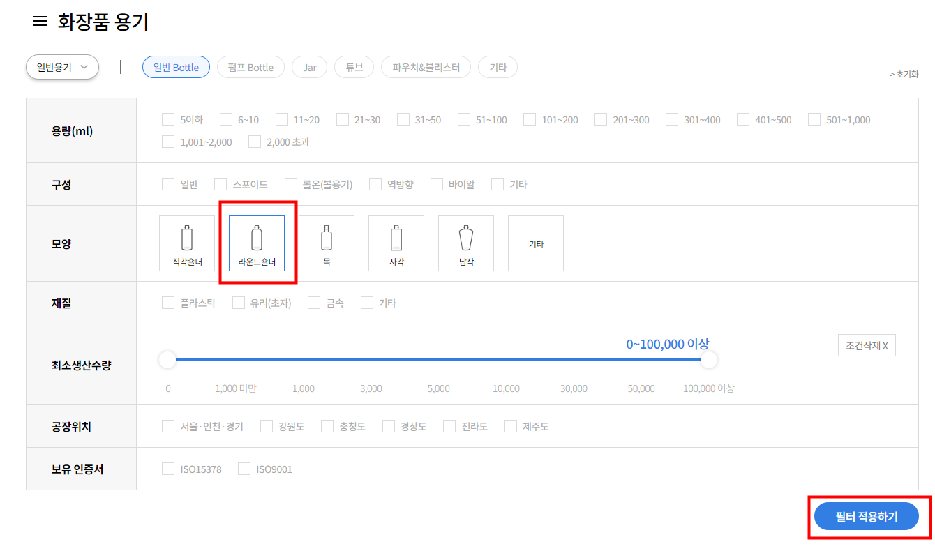 그럼 필터를 설정할 수 있는 곳이 나온답니다. 생각하신 부자재 특징을 선택해 주시면 되는데요, 예를 들어 어깨가 둥근 용기를 하고 싶으시다고 해 볼게요.