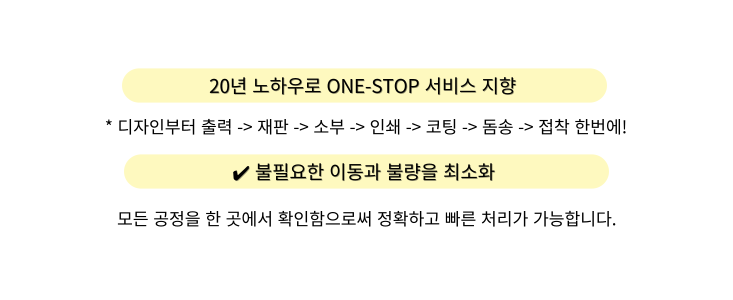 저희는 20년 된 노하우로 ONE-STOP 서비스를 지향하여 디자인에서 시작하여 출력 -> 재판 -> 소부 -> 인쇄 -> 코팅 -> 돔송 -> 접착을 한 번에 이루어 냈습니다. 그 결과 인쇄 업계에서 원가 절감을 통해서 경쟁력을 갖출 수가 있었고 불필요한 이동을 줄임으로써 시간을 단축하고, 불량을 최소화 할 수 있었습니다. 그리고 모든 공정을 한 곳에서 확인함으로써 고객에게 신뢰를 얻고, 보다 정확하고 빠르게 일을 처리할 수 있는 능력을 갖출 수 있었습니다. 이로인해 편안한 마음으로 전 직원이 하나가 되어 일의 능률을 키우고, 회사에 무궁한 발전에 도움을 얻을 수가 있었습니다.